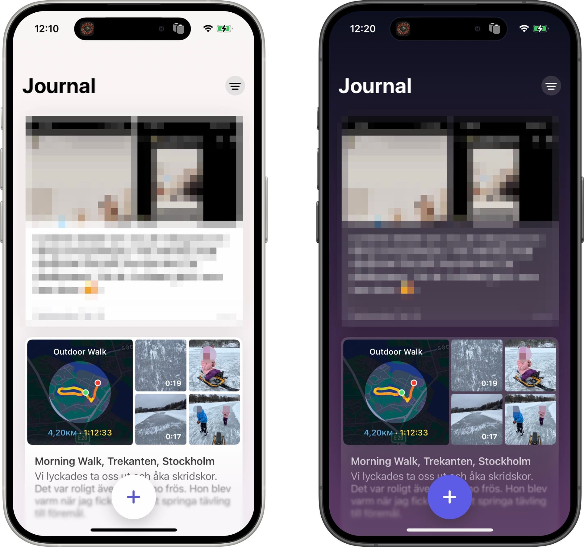 The Apple Journal app uses a large floating plus button at the bottom, with a gradual blur behind it, similar to my designs for Handla. Traditionally these buttons have been common place on Android, but here we see Apple trying a very prominent one on iOS. It felt right for this particular app to put a strong emphasis on writing a new journal entry.